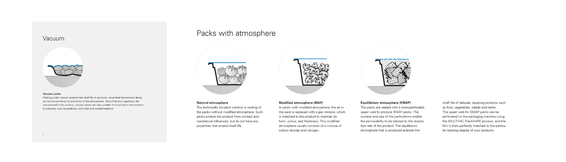 - Passive MAP: This method is used exclusively for fresh, respiring produce like salads and cut vegetables. In passive MAP, the product is sealed in a package made from a film with specific gas permeability characteristics. The modified atmosphere is not injected but develops naturally over time. The product's own respiration consumes the