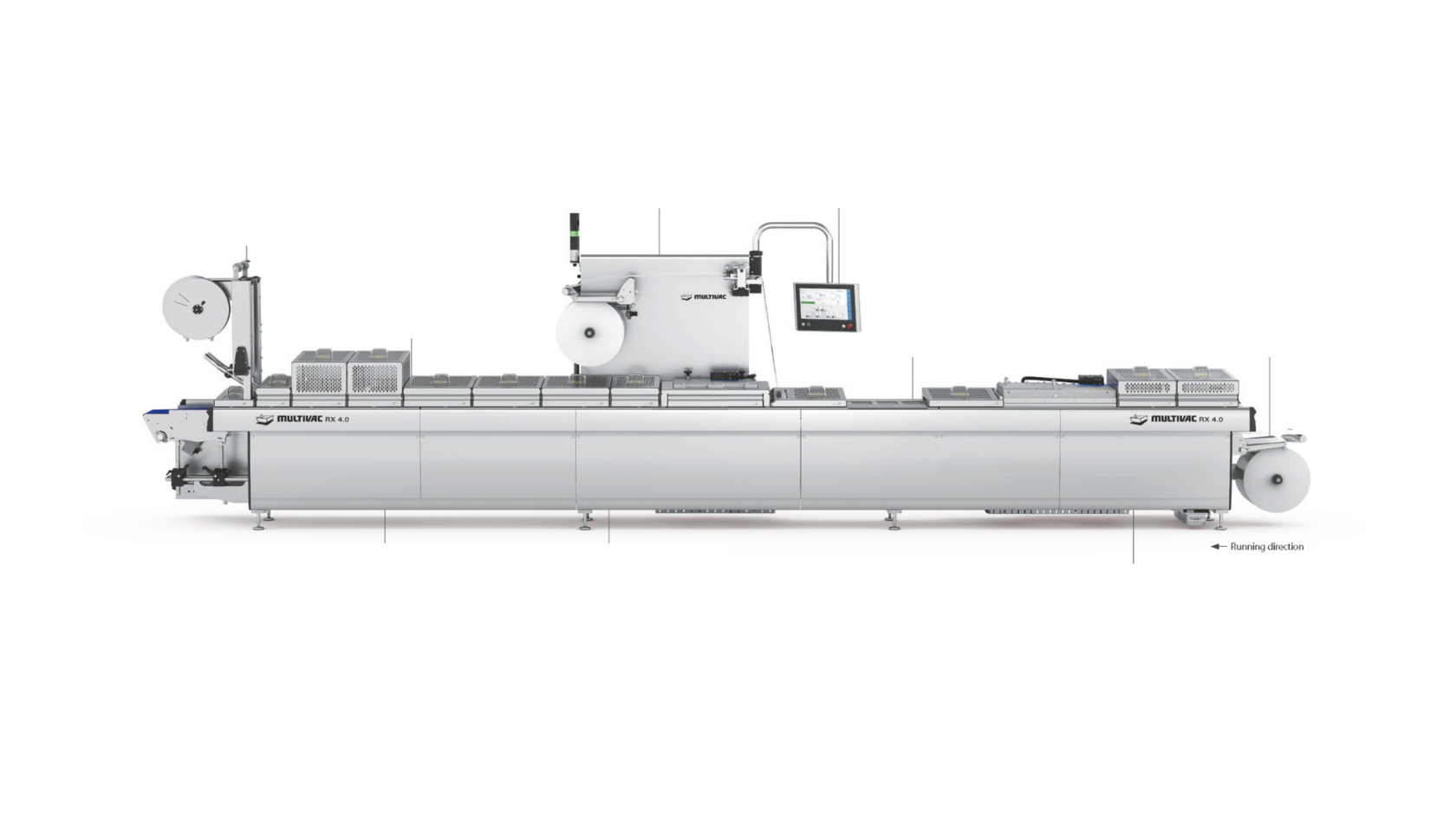 - Loading Zone: The newly formed web of trays advances to an extended loading zone. This area provides ample space for the product—such as ready-to-eat meal components, fresh meat portions, or sliced deli meats—to be placed into the pockets. This can be done manually by operators or, for higher speeds and improved hygiene, via fully automated systems like Multivac's Horizontal Loader. One documented configuration of the R245 features a loading zone over 2.6 meters long.